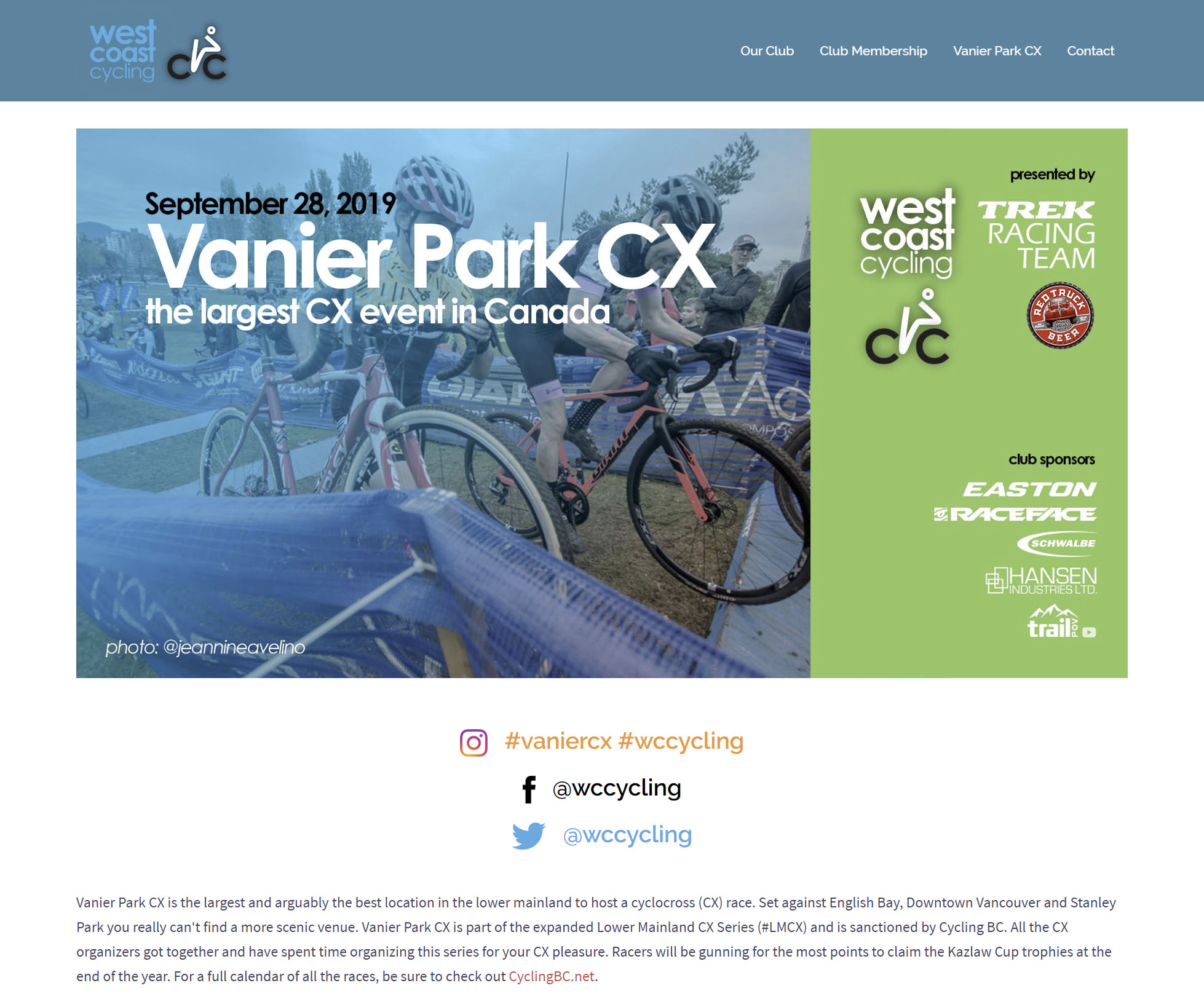 - What we did: West Coast Cycling is a cycling club in Vancouver, BC that operates the largest cyclocross event in Canada. They were needing a promotional site for their club that could be easily edited by members and such wanted to use Wordpress. For this project I adapted a commercially available Wordpress theme to suit their needs perfectly. All the graphics including the club logo and banners were designed by ourselves.